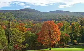The Scenic Trail, the longest in the forest at 5.9 miles (9.5 km), runs from its western trailhead on Old Mineral Springs Road near the falls atop the ridge past Spy Rock to end at a junction with the Stillman near Mount Misery.[11] The Stillman Trail, named for the forest's founder, is actually a continuation of a trail that begins in Cornwall on Hudson and goes over Storm King, then crosses 9W into the forest. It runs 5.3 miles (8.5 km) across the forest and over Black Rock to end at an overlook to Schunemunk Mountain and Mountainville near the forest's western boundary.[12]