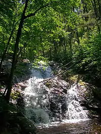 Most public access comes from Route 9W, near the lowest portions of the land, and many of the research and educational facilities are located in that north central area. To the south, in the Highlands portion of the forest, the land rises over a thousand feet (300 m) to several peaks, including the eponymous 1,402 foot (427 m) Black Rock with its observation tower and Spy Rock, at 1,463 feet (446 m)[7] the highest point in the Town of Highlands and the highest peak in the Highlands west of the Hudson River.[1][8] There are seven ponds in the forest,[7] all of which form part of the village of Cornwall on Hudson's water supply system save Sutherland Pond, the only one in which visitors are allowed to swim.[9] The ponds drain into an unnamed stream that crosses the village and empties into Moodna Creek near where it joins the Hudson; Sutherland gives rise to Mineral Springs Brook, which flows out to the scenic Mineral Springs Falls near the western end of the forest and then to Moodna Creek's main tributary, Woodbury Creek.