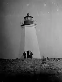 In 1807, the United States government bought the 9.5 acres (3.8 ha) of land upon which the lighthouse stands from Daniel Fayerweather for $200.[3] The government appropriated $5000 for the light station in February 1807 and contracted Abisha Woodward to construct the light.[3][4] The first Black Rock Harbor Light was a 40-foot (12.1 meter) octagonal wooden tower built in 1808.[3] Abisha Woodward, who previously constructed the 1801 New London Harbor Light and the 1802 Falkner Island Light, constructed a wooden tower that was lit and made operational by October 1808.[5] The lightkeeper's home was a small 1+1⁄2-story home built on the opposite side of a marsh, several hundred feet away from the tower.[5] Another brick structure was built to house the oil.[5] The total cost of the wooden lighthouse, and likely the accompanying keeper's house and oil house, was listed at $4604.69.[6]
