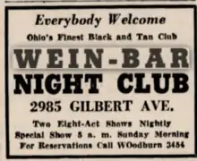 The Wein Bar,[9] located in Cincinnati, Ohio was started in 1934 by Joseph Goldhagen, who during the 1920's, was active in the commercial production of illegal alcohol until the Prohibition period ended and the bar was opened. During the 1930's, the bar had multiple live performances daily, and over time, the bar evolved into an R&B live performance venue with regional and national music entertainment. Popular musicians include; Fats Waller, Lionel Hampton, Lou Rawls, James Brown and notably the formation of the James Brown funk era band (The J.B.'s) occurred during a live fundraising performance at the bar. From the early years, it was a meeting place for planning civil rights activism, organizing travel outside the region for protests events, and was an ongoing fund raising location for the NAACP. The bar was closed in 1980 after more than 40 years of operation, and was possibly the longest operating establishment that catered to the black community, its musicians, and in active support of their civil rights.