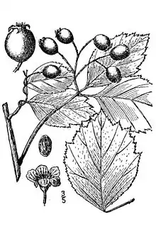 Crataegus douglasii is a compact erect bushy shrub growing to 8–9 metres (26–30 feet) tall with a trunk of up to 10 centimetres (4 inches) thick.[3] It is covered in fan-shaped green leaves about 2.5–5 cm (1–2 in) long[3] with teeth along the distal margin. Thorns along the branches are 1–2.5 cm long.[3]