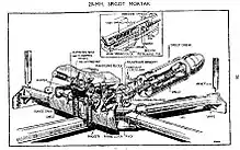 The Bombard was a 29mm spigot mortar,[1] weighing 112[12] alone and 360 lb,[11] on its mobile platform. It was able to fire a 20 lb high-explosive bomb to a range of approximately 100 yards; when the bomb detonated, it was able to inflict significant damage on a tank, although it was unlikely to actually pierce the vehicle's armour as the projectile was not able to gain sufficient velocity.[6] It was served by a crew of between three[1] and five men[11] The Bombard was considered to be most effective at short range, with targets being engaged with 'considerable success' at a range of between 75–100 yards.[1] It was a muzzle-loaded weapon and therefore had a slow rate of fire, averaging between six[13] and twelve rounds per minute; as such it was considered vital that the weapon be well-camouflaged and that it hit the target with the first shot. Two types of ammunition were provided for the weapon – a 20 lb anti-tank bomb and a lighter 14 lb anti-personnel bomb,[13] with each weapon being issued with 150 rounds of the former and 100 of the latter.[1] The anti-tank rounds were found to possess several problems. They had insensitive fuzes, which meant that they would often pass through an unarmoured target without detonating, and when they did explode fragments were often thrown back at the crew.[11] The Bombard was either affixed to a large cruciform platform, or an immobile concrete pedestal;[12] in either case would usually be placed in range of defensive positions, such as road-blocks.[7] It seems that there was a preference for the Bombard to be used primarily in a static role, with extra mountings being built by the Royal Engineers to provide alternative positions from which the weapon could be fired.[1] In a static position, the weapon was usually emplaced in a pit with ammunition lockers nearby.[13]