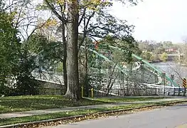 The bridge was closed to all traffic on 13 May 2013, for the purpose of extensive infrastructural assessment and repair, with plans to re-open it by August 2013.[10] Due to the extent and cost (approximately $3M) of repairs required, the closure was extended indefinitely, and subsequently re-opened to pedestrian traffic in December 2013.[11] Access was restricted to a pedestrian pathway by using temporary fencing, pending an environmental assessment to determine whether it will be feasible to re-open the bridge to vehicular traffic. It was re-opened on December 1, 2018.[5] After being closed again to cars in April 2020, it was re-opened on November 8, 2021.[12]
