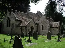 The church, which probably dates from the 13th century, is a small rubble-stone building with a west bellcote. In the chancel, two small windows are 13th-century, and Orbach states that two triangular-headed windows have Anglo-Saxon monolith surrounds. The two-light east window is 14th-century, and in that century the chancel roof was replaced and the nave rebuilt; these roofs are still in place.[18][10][19]
