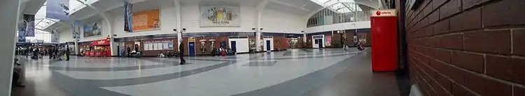 The station is staffed and open for 24 hours a day, and is equipped with payphones, vending machines, toilets and indoor seating,[10] as well as a customer service office and a booking office.[11] Step-free access to the station and platform is available for passengers with wheelchairs or prams, and portable ramps are also available for platform-to-train access.[10] The station has its own covered concourse and, adjoining the concourse, it has a Pumpkin cafe, as well as a Point shop to Go convenience store.[11] The station also has a 30-space car park,[10] and adjoining bus connections, which can also accommodate Plusbus ticket holders.[12]