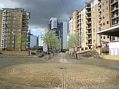 The 1980s, Blackwall saw the area first redevelopment project, a luxury housing complex called Jamestown Harbour over the Blackwall Basin, designed by WCEC Architects for the Wates Group and was completed by 1985. Jamestown Harbour was one of the first housing developments of the London Docklands. With its brick-built warehouse-style exteriors and distinctive blue and red balconies, it was designed to recreate the appearance of traditional river and dockside warehouses.[21]