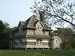 The hamlet was designed by John Nash, master of the Picturesque style. He had worked for Harford on other buildings. The hamlet is the first fully realized exemplar of the garden suburb and laid out the road map for virtually all garden suburbs that followed.[4] The cottages are all unique and include brick chimneys and dormer windows with some having thatched roofs.[5] They are examples of the picturesque, an aesthetic ideal introduced into English cultural debate in 1782 by William Gilpin.[6][7] An oval path links the cottages and encircles the village green with its sundial.[8] The cottage gardens are planted in a Victorian cottage garden style.[9]