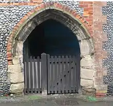 The medieval building was eventually abandoned, and much of the structural material was taken for reuse in Blakeney and Cley villages.[1] A stone archway in Cley is traditionally believed to have come from the chapel, and would fit the western entrance, although it could have been brought from elsewhere such as the ruined Blakeney friary. The 'chapel' building was deserted around 1600, but whether the collapse of its east end was the cause or a consequence of its disuse is unknown.[15] The main building seems to have suffered a major fire at some stage,[19] and no wooden structures have been found. The site was flooded at least three times, subsequent to the building's collapse.[15] At some stage, part of the western wall was lost, the steep slope where it stood suggesting that it may have been taken by the sea.[1]