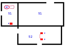 At the same time that S2 was built, a dividing wall, again of inferior quality, was built across S1 to create a western room.[15] There were no molehills within the smaller building, which had suggested that, unlike its neighbour, it has a buried solid floor,[1] and this was confirmed by excavation. The floor was originally made of mortar, relaid at least once, but then covered with a layer of flint cobbles, suggesting that it was a working area. The old hearth was not covered, so it may have still been used. A new fireplace was also added, apparently of a domestic design, although the context makes that function improbable.[15] A well-marked track led southwest down the slope from S1, and a large midden was close to the path. It has been suggested that a "clean" pit north of S1 was a well, with fresh water floating above the saltwater below, a phenomenon known from Blakeney Point[15] and elsewhere on the Norfolk coast.[23][24]