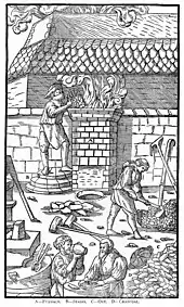 The earliest evidence of permanent occupation is a series of ditches of 11th or 12th century date which are believed to have formed an enclosure, the south east corner of which lies below the "chapel". Evidence for any buildings within the enclosure has either been lost to the Glaven or is buried outside the survey area. Few finds were associated with the ditches, although some fragments of Roman or earlier pottery and three Henry III pennies were found nearby.[15] As elsewhere on the site, there is little evidence to link the old pottery to its location when found.[16] By the time of the construction of the main building, some time in the 14th century, the ditches had filled with sand. A small hearth was built at ground level, shortly before or during the erection of S1. It appears to have had fairly light use, but the presence of slag suggests that it was intended for smelting iron, perhaps by a smith. There was evidence for a number of small fires elsewhere in S1 at a similar date to the hearth, but whether they were related to the smelting is unknown.[15] At this time, hearths could not melt metallic iron, but produced a 'bloom' (a mixture of iron and slag) which could be converted to wrought iron by repeated heating and hammering. Another, even earlier, smelting hearth is known from West Runton, 17 km (10 mi) further east on the Norfolk coast.[17] The main ore in this area is the iron-rich local carrstone.[18]