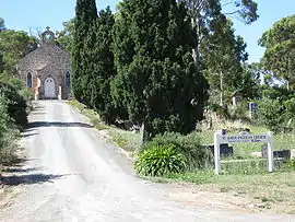 St James Church of England, in the town of Blakiston, is the fifth oldest Anglican Church in South Australia. The 10 acres (4.0 ha) of the Church, Cemetery and Rectory was bought by George Morphett and Samuel Stocks from McFarlane in 1843 and was given for the building of the church in May 1846. The parsonage was completed, and occupied by the Rev. James Pollitt, in late 1846 and completion of the church building was promised for the following year.[4] Sentence of consecration was pronounced and the Church consecrated by the Lord Bishop of Adelaide on 28 April 1848. The Church is constructed of sandstone and includes the Chapel and Rector's changing room. The Church includes some pretty stained glass windows, old pews and a small organ. Adjacent to the Church is a small bell tower of later heritage. As of 2008, the Church and cemetery are still in use, while the Rectory and surrounding acreage are rented by the Church of England to private tenants.
