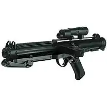 Blaster small arms come in a range of sizes, from small hand-held blasters to carbines and larger laser rifles. Some are equipped with features such as a targeting scope or flash and noise suppressor.[10] Others are highly customizable like the A300 blaster rifle used by Rebel commandos on Scarif, with a removable shoulder stock, swappable barrels of different sizes, and other attachments.[16] Certain modifications however are considered inhumane and banned on civilized worlds: the Trandoshan doubler or tripler when added to the barrel of a blaster pistol turns it into a devastating hand cannon.[18] Crew-served blasters also exist, an example being the E-web heavy repeating blaster deployed by snowtroopers on Hoth. The most powerful repeating blaster employed by the Empire, the weapon requires a crew of two to set up its power generator and a rigid mount to counteract the fearsome weapon's recoil.[19]