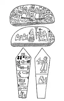 The Blau Monuments are dated within the Uruk III/Jemdet Nasr to Early Dynastic I period. Some authors date the pair as early as 3100 BC on the basis of the proto-cuneiform script, while others date them to the ED I period around 2700 BC because of other stylistically similar land sale records with a definite date in the ED I period.[6][7][8][9][10] Both dates are equally represented in scholarly works; the majority of works citing the earliest date usually reference Gelb in their turn.