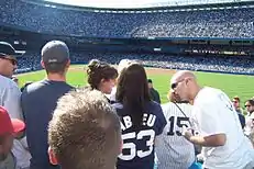 In 1999, when David Wells made his first appearance at Yankee Stadium after having been traded to the Toronto Blue Jays, his name was chanted. In his tenure with the Yankees, he was the only Yankee pitcher to be included in the Roll Call every time he pitched. Alfonso Soriano's name was chanted when he made his first appearance after being traded to the Texas Rangers.[15] In the 2006 home opener against the Kansas City Royals, the Bleacher Creatures chanted the name of long-time Yankee outfielder Bernie Williams, who was the designated hitter that day, right after the rest of the defensive lineup. Williams, whose future in baseball was uncertain in the offseason, was in the clubhouse at the time and did not hear the Creatures. The chants continued for around 5 minutes until Williams came out and waved.[16] At the beginning of the 2007 season opener, the Creatures started a chant of "We want Bernie!", a reference to the fact that Williams was no longer with the team.[17]