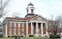 The architect J.J. Baldwin of the architectural firm of Gayre & Baldwin designed the courthouse, one of eight Georgia courthouses designed by Baldwin. The building is in the Classical Revival style.[3] It is made of brick, with white columns and stone trim.[4] Wilbur W. Caldwell writes that while the building it "pleasant and serviceable ... it lacks exuberance and flair," and it is one indication that by 1912, "the age of flamboyant courthouse building was over in Georgia," as county courthouse design became more restrained.[4]
