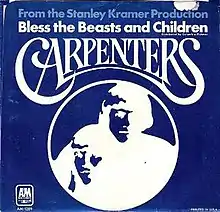 "Bless the Beasts and Children" is the theme song to the 1971 eponymous film and was performed by the Carpenters. It was featured on the B-side to their hit, "Superstar". The B-side charted on the Billboard Hot 100, eventually topping out at #67.[1] In order to promote it, The Carpenters performed it on their television series, Make Your Own Kind of Music, as "F" for "Film Music".[2] It was nominated for a 1972 Academy Award for Best Song, but it lost to Isaac Hayes's "Theme from Shaft".