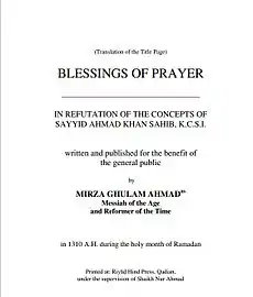 Blessings of Prayer is an English translation of the Urdu book Barakātud-Du‘ā’ by Mirza Ghulam Ahmad, published in 1893. It was written in refutation of Muslim leader Syed Ahmad Khan’s rationalising expositions concerning prayer and as a correction of his principles of Quranic exegesis. The work upholds belief in the miraculous effects of prayer and outlines seven criteria for Quranic interpretation.
