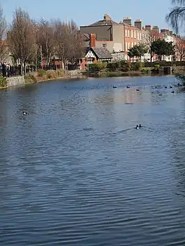 The Blessington Street Basin was built in the early 19th century by Dublin Corporation. Construction began about 1803 and finished in 1810, the plant was opened as the Royal George Reservoir, named in honour of King George III.[2] The basin is rectangular, about 120 m long and 60 m wide basin took about 4 million gallons (15.1 million litres) of water.[3] The water came from Lough Owel in County Westmeath,[2] carried by pipe along the Royal Canal through a 3 km long pipeline into the basin at the western end of the Blessington Street. From its construction, the site was used as a public park.[4]