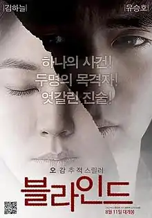 Blind (Korean: 블라인드; RR: Beulraindeu) is a 2011 South Korean crime thriller film directed by Ahn Sang-hoon with screenplay by Choi Min-seok which won the "Hit By Pitch" project fair held by the Korean Movie Producers Guild in 2009. It stars Kim Ha-neul and Yoo Seung-ho. Kim received Best Actress honors at the 48th Grand Bell Awards and the 32nd Blue Dragon Film Awards for her performance.[3][4][5]