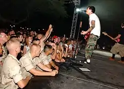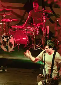 As the record neared completion by August 2003, the band performed for a short time for the armed forces in the Middle East and premiered more new songs at their Reading and Leeds sets.[25][33] The trio shot small, home-made videos for several songs on Blink-182, as well as the official music video for "Feeling This", the song they picked as the first single.[23][34][35][36] The band spent time to finalize the CD booklet and album artwork in September. Mark Hoppus stated that the album was so "personal to all three of us that we really wanted to be involved in every aspect of it."[23] The release date kept getting missed and pushed back to the point where Jordan Schur, then-president of Geffen Records, made calls asking, "What is the absolute last possible second that we can turn this thing in and still make our release date?"[23] DeLonge described the final days of mixing the album as "crazy stressful", with "literally hours to turn [the album] to have it come it out on time."[23] The album was in production so late that final mixes were still being judged by Hoppus, DeLonge, and Barker the night before the album was sent to the pressing plant.[23] For Barker, he later considered it his favorite time in the band's history, commenting, "That was a good time in my life. I was smoking just enough weed and taking just enough pills."[15]
