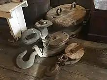 A block is a set of pulleys or sheaves mounted on a single frame. An assembly of blocks with a rope threaded through the pulleys is called tackle. The process of threading ropes or cables through blocks is called "reeving", and a threaded block and tackle is said to have been "rove".[7] A block and tackle system amplifies the tension force in the rope to lift heavy loads. They are common on boats and sailing ships, where tasks are often performed manually, as well as on cranes and drilling rigs, where once rove, the tasks are performed by heavy equipment.