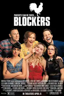 Blockers is a 2018 American sex comedy film directed by Kay Cannon in her directorial debut and written by Brian and Jim Kehoe. It stars Leslie Mann, Ike Barinholtz, and John Cena as a trio of parents who try to stop their respective daughters (Kathryn Newton, Gideon Adlon, and Geraldine Viswanathan) from losing their virginity on prom night. The title of the film is a reference to the act of "cockblocking", with marketing materials displaying a rooster (also known as a cock) above the title.