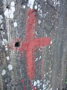 The Blood Road (Norwegian: Blodveien) is a route northeast of Rognan in the municipality of Saltdal in Nordland county, Norway that was built by prisoners during the Second World War.[1][2][3] The route was a new section of Norwegian National Road 50 between Rognan and Langset on the east side of Saltdal Fjord (Saltdalsfjorden), where there was a ferry service before the war. The specific incident that gave the road its name was a cross of blood that was painted on a rock cutting in June 1943. The blood came from a prisoner that was shot along the route, and the cross was painted by his brother.[2][4]: 16 [5]