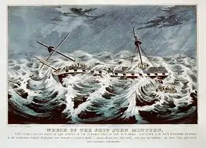 On February 14, 1846, the Blossom was cruising at sea. She put Pilot John Oxer on the brig Moses. She then sighted the ship Orleans and packet ship John Minturn, that she sailed to hoping to put a pilot on board. Both ships declined the Blossom's services because they favored the New Jersey and underwriters' pilots. The Blossom belonged to the old New York fleet. When the weather got bad, the John Minturn took on the Blossom's Pilot Thomas Freeborn. The bark New Jersey took on another of the Blossom's pilots. The Blossom headed home with boatkeeper Thomas Orr in command. Pilot Thomas Freeborne ran into trouble on the John Minturn when trying to guide the ship in bad weather. The ship was pushed toward the Jersey Shore and ran ashore on Squan Beach. Thirty-eight out of fifty-one persons perished including Pilot Thomas Freeborne.[9] The disaster was commemorated in an 1846 lithograph by Currier and Ives.[10] The 1846, wreck sparked the development of the United States Life-Saving Service, an agency that would assist shipwrecked crews and passengers.[11] The Pilots' Monument to Thomas Freeborn was built by James D. Smillie in 1847 and is at the Green-Wood Cemetery.
