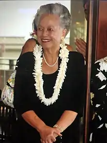 Blossom Puanani Alama-Tom (born July 31, 1930) is a Living Treasure of Hawaiʻi and the last surviving judge of the first Merrie Monarch Festival. Alama-Tom is also an entertainer, a kumu hula, a hula judge, and a musician. Since 1940, Alama-Tom has performed at the City and County of Honolulu Department of Parks and Recreation’s Nā Hula Festival.[1]