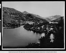 A mineral springs resort was founded at Blue Lakes, visited both by the sick for cures and by the wealthy and fashionable as summer resorts.[5] The Blue Lakes Hotel could accommodate 40-50 guests, and had a white sulphur spring on its 320 acres (130 ha) grounds. The neighboring forests had plentiful game, including deer, rabbits, quail and pigeons.[18] Resorts in 1892 included Laurel Dell, a Swiss cottage on a grassy flat on the lower lake with smaller corrages around it, the Blue Lakes Hotel, with a hotel and several pretty cottages, where the upper lake flowed into the lower in a lawn-like expanse of grassland with clumps of gnarled and moss-covered oak, and Le Trianon, a very prettily situated hotel at the upper end of the upper lake.[19]