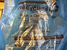 A blue bag is a blue coloured, sometimes semi-transparent bag for waste, mandated for use in some localities for refuse or for certain specific types of refuse: the distinguishing color serves to assist in recycling programs. Typically, it would be used for glass, plastic or polyethylene content.