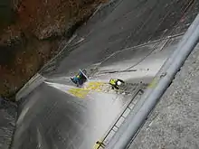 Projects such as Hiwassee Dam[12] and Fontana Dam[13] have been a focus of the company as well, also see their work with Tennessee Valley Authority.[14] With regard to dam remediation and upgrades, slot cutting projects are the company's main focus. It is akin to slicing a concrete dam like a piece of birthday cake. The technique is simple but very difficult, rotate a loop of cable strung with diamond embedded beads through the structure — essentially, like using a loop of fishing line to cut a cake. Slot cutting is employed to create expansion joints in dams afflicted with compression stresses due to concrete swelling. Alkali Aggregate Reaction, or AAR, is a chemical reaction in concrete created where the aggregate has a high silicon dioxide content. The southeast USA is one such region, and dams in that area require periodic slot cuts to avoid cracking, leakage, and interference with mechanical components such as gates and turbines. The time intervals depend on the AAR specifics of each structure, but 10 years is an average.