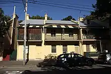 Early Victorian, two-storey terrace with four bedrooms, sleep-out and attic. Features include a concave corrugated iron verandah painted in wide stripes, iron lace balcony and column supports and spear fence at ground level. Ground floor has a double hung window and front door with fanlight above. Upper level has two french doors opening onto balcony. Shutters on all windows. Storeys: Two; Construction: Painted rendered masonry, corrugated galvanised iron roof. Timber verandah with iron lace and balcony columns. Spear fence balustrading at ground level. Style: Victorian Filigree.[1]