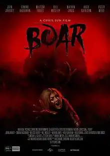 Boar is a 2017 Australian horror film written and directed by Chris Sun[1] about a young family that find themselves in the Australian countryside, being hunted by a bloodthirsty wild boar. The film stars Nathan Jones, John Jarratt, Christie-Lee Britten, and Melissa Tkautz, with special appearances by Chris Haywood and Steve Bisley.