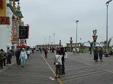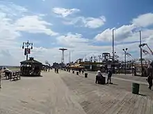In the 19th century, seaside living and entertainment became popular. Primarily in the Jersey Shore coastal region of New Jersey, United States, walks made of boards (hence the name 'boardwalk') began to be placed among seaside hotels and other establishments so as to prevent beach sand from being tracked into the buildings. These structures were not initially permanent, being taken down in the fall and then replaced the following spring, but eventually permanent boardwalks began to be placed.[1] These boardwalks eventually expanded to become wider and taller to account for pedestrian traffic, and railings were added to make them safer. As the areas became more developed, more businesses began to move into boardwalk districts, and eventually amusement rides such as the carousel came to larger boardwalks. By the beginning of the 20th century, boardwalks had become destinations unto themselves, with events such as Easter parades becoming mainstays of the boardwalks. In the mid-1900s, however, this began to change as a combination of competitions from other dedicated Theme Parks such as Disneyland and hurricanes attacking the outdated boardwalk infrastructure. As a result, the boardwalk lost some of its popularity.[3] Regardless, today's boardwalks such as the Atlantic City Boardwalk in New Jersey, Coney Island in New York, or the Kemah Boardwalk in Texas remain popular tourist attractions to this day.[4]