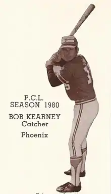 Kearney was drafted by the San Francisco Giants in the fourteenth round of the 1977 Major League Baseball Draft out of the University of Texas.[2] He made his major league debut with the Giants late in the 1979 season, but returned to the minor leagues for the following season.[1] Kearney was drafted by the Oakland Athletics from the Giants in the 1980 minor league draft.[3] Kearney's strong throwing arm was made evident in a game against the Tacoma Indians in 1981 when, he threw out five baserunners attempting to steal second base.[4] He was selected as the catcher for the 1981 Pacific Coast League Northern Division All-Star team.[5]
