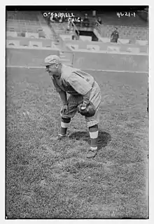 O'Farrell was born in Waukegan, Illinois where he grew up a Chicago White Sox fan. He signed with the Cubs in 1915 after playing an exhibition game for his local semi-professional team.[3] His first manager was former catcher, Roger Bresnahan, who helped O'Farrell develop his catching skills.[4] After a season on the bench, O'Farrell was sent to Three-I League where he spent two years before returning to the Cubs for the 1918 season.[5] He served as backup catcher working behind Bill Killefer as the Cubs went on to claim the 1918 National League pennant before losing to the Boston Red Sox in the 1918 World Series.[6] O'Farrell went hitless in three at bats during the series.[7]