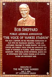 In 2000, during his 50th year with the Yankees, Sheppard donated the microphone he used for a half-century of Yankee Stadium announcements to the Baseball Hall of Fame in Cooperstown, New York.[7] May 7 of that 50th year was designated "Bob Sheppard Day", and a plaque honoring him was unveiled in Yankee Stadium's Monument Park. At the pre-game ceremony Walter Cronkite read the inscription, which states in part that his voice was "...as synonymous with Yankee Stadium as its copper facade and Monument Park."[15] The media dining room in the new stadium is named "Sheppard's Place".[6]