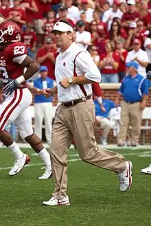 Stoops played college football at the University of Iowa as a defensive back from 1979 to 1982. Prior his tenure at Oklahoma, he held various assistant coaching positions at the University of Iowa, Kent State University, Kansas State University, and the University of Florida. Stoops was awarded the Paul "Bear" Bryant Award in 2000 and the Walter Camp Coach of the Year Award in 2000 and 2003.[3] He has been nicknamed "Big Game Bob" by both supporters and detractors.[4]