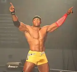 Lashley regained the championship on January 7, 2015 after interference from MVP, King, Samoa Joe and Low Ki, as well as Eric Young turning on Roode.[68] On the June 3 episode of Impact Wrestling, Lashley defeated Eric Young after Chris Melendez distracted Young. At Slammiversary, Lashley teamed with Mr. Anderson against Ethan Carter III and Tyrus in a losing effort. On the August 12 episode of Impact Wrestling, Lashley defeated Jessie Godderz in a qualifying match for the King of the Mountain match for the vacant TNA King of the Mountain Championship, which was won by PJ Black.[69] On the August 26 episode of Impact Wrestling, Lashley competed in a four-way match for a shot at King of the Mountain Championship, which was won by Bobby Roode. On the September 16 episode of Impact Wrestling, Team TNA (Lashley, Drew Galloway, Davey Richards, Eddie Edwards and Bram) defeated Team GFW (Jeff Jarrett, Eric Young, Chris Mordetzky, Brian Myers and Sonjay Dutt) in a Lethal Lockdown match. On October 4 at Bound for Glory, Lashley unsuccessfully challenged Bobby Roode for the TNA King of the Mountain Championship.[70] During October and November, Lashley began competing in the TNA World Title Series for the opportunity to win the vacant TNA World Heavyweight Championship, where he ended second in his block to successfully advance to round 16 where he defeated Drew Galloway to advance into the quarterfinals and Mahabali Shera to advance the semifinals, but he failed to qualify for the finals when he was defeated by the eventual winner Ethan Carter III.