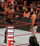 On the April 9, 2018 episode of Raw, the night after WrestleMania 34, Lashley made his return to WWE after a ten-year absence, becoming a member of the Raw brand once again, where he confronted and attacked Elias with a chair.[81] The first month of Lashley's return would see him in a number of tag-team matches, teaming with the likes of Braun Strowman, Bobby Roode, Finn Bálor, Seth Rollins, and Roman Reigns, all being in victorious efforts against the likes of Kevin Owens, Sami Zayn, Jinder Mahal, The Miz, Curtis Axel, and Bo Dallas.[82][83][84] Lashley would later team with Braun Strowman at Backlash in a victorious effort against Kevin Owens and Sami Zayn.[85] Following Backlash, Lashley would enter into a feud with Sami Zayn, culminating with Lashley facing Zayn in a victorious effort at Money in the Bank.[86] Lashley then entered a feud with Roman Reigns, where both men believed that they were the rightful challenger to the Universal Championship.[87] This led to a match between the two at Extreme Rules, where Lashley defeated Reigns.[88] The following night on Raw, two triple threat matches were set to determine who would face Universal Champion Brock Lesnar at SummerSlam, with Lashley and Reigns won their respective matches, setting up a number one contender's match between the two the following week,[89] which Reigns won.[90]