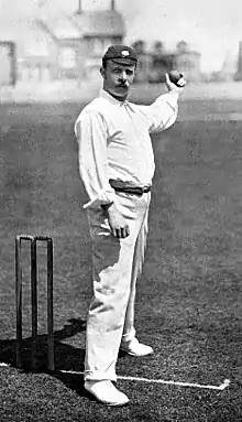 Wisden said that as a bowler, Peel had a "fine length, easy action and splendid command of spin", which meant that he "was often a match-winner".[8] Peel consistently bowled a good length and varied the flight of the ball to deceive batsmen. He also bowled a quicker ball which, in contrast to his usual delivery, travelled in a straight line instead of turning. On a pitch affected by rain, batsmen found him very difficult to face, and he was very successful in these conditions.[1] When bowling on pitches where the ball came more slowly off the surface, Peel often bowled faster; this pace made it difficult for batsmen to score runs against him even when conditions were in their favour. After he delivered the ball, the spin he imparted often made it curve in the air before it reached the batsman. According to Woodhouse, when bowling, "Peel brought his arm behind his back with a peculiar flourish-like action and then 'whipped the ball down'".[4] He generally opened the bowling,[125] including when he played for England.[32] At the time, it was general practice to open the bowling with a fast bowler and a left-arm spinner.[125][126]
