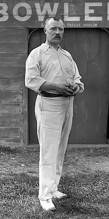Peel was the first English bowler to take 100 Test wickets against Australia.[85] At a time when international matches were relatively rare, his 20 Test matches were a considerable achievement, and it was unusual for a player to tour Australia as often as he did: he went there four times.[1] His main rival as a spinner and for a place in the England team was Johnny Briggs; Peel bowled faster, which made him harder to hit.[4] Archie MacLaren, who captained England from the late 1890s and was a team-mate and captain of Briggs, described Peel as "the cleverest bowler of my time".[127] MacLaren stated that Peel thoroughly understood tactics and could spot weaknesses in a batsman's technique. He concluded: "I place Peel first on my list of great left-handed bowlers on account of his wonderful judgement, his diabolical cleverness and his great natural ability."[128] When Rhodes took over the role of left-arm spin bowler in the Yorkshire team, there was some debate over who out of Peate, Peel and Rhodes was the best left-arm spinner to play for Yorkshire.[129] Historians regard Peel as part of a long-lasting chain of successful Yorkshire left-arm spinners, preceded by Peate and succeeded by Rhodes.[8][85]