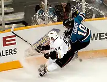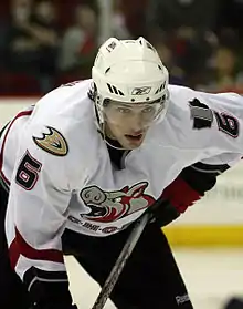 In the following 2008–09 season, Ryan once again made the opening roster, but was to be sent down to the Ducks' new AHL affiliate, the Iowa Chops, due to salary cap issues.[11] He was recalled during the season and recorded a natural hat trick, the first hat trick of his NHL career, on January 8, 2009, against Los Angeles at the Staples Center in a 4–3 loss. In doing so, he became the first rookie in Ducks history to record a hat trick, it being the fastest of any player in the 15-year history of the franchise.[12] On March 22, 2009, Ryan broke the franchise rookie point record set by Dustin Penner after tallying two assists for his 46th point in an Anaheim win over the Phoenix Coyotes.[13]