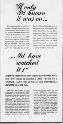 The thoroughly professional qualities of Rex Rienits' writing in his play Bodgie were fairly satisfactorily matched in production and acting... Mr Rienits has said very little that is new in his neatly tailored but conventional plot about the eroding effects of crime and its spurious glamour on a weak character, or about the relative moral positions of the blackmailer and his victims - around whom the play revolves. But then his aim, justifiably, is not sociological comment but entertainment. Not that social comment was entirely missing. John Ewart as the "bodgie" at least showed how the mind of a lay about turned involuntary murdered, works, although the part gave him little opportunity to reveal why it gets that way. This was a well-observed performance in which Ewart gave a convincing air to the egg-shell thin toughness covering a profound insecurity, and the desperate hysterical bravado used as a cloak for cowardice. This may not have been the picture of a typical "bodgie" but it was a good portrait of a scared, lonely, weak - and as a result of this, criminal - young man. With its use of filmed Sydney backgrounds, and some carefully designed studio sets, Ray Menmuir's production added some refreshing authenticity to the tensions generated by the author's clever writing and Alan Seymour's adaptation... support cast acted adequately, but without much imagination.[8]