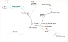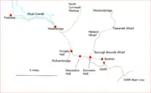 - Borough Bounds Wharf, later also known as Dunmere Wharf; on the Wenfordbridge side of Boscarne Junction; grain to Hawke's Mill;