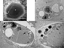 | (A) shows a mature BsV virion. (B) shows a healthy Bodo saltans cell. (C) and (D) show a post-infection state, assembly, and maturation of the virus inside a Bodo saltans cell. | |