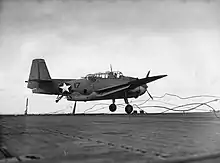 The Bogue class had the capacity for up to 24 anti-submarine or fighter aircraft, which could be a mixture of the Grumman Wildcat, Vought F4U Corsair and Grumman Avenger. The exact composition of the embarked squadrons depended upon the mission. Some squadrons were composite squadrons for convoy defence, and would be equipped with anti-submarine and fighter aircraft,[5] while other squadrons working in a strike-carrier role would only be equipped with fighter aircraft.[6] When utilised in ferry service the ships could carry up to 90 aircraft between both the flight and hangar decks. Aircraft facilities consisted of a small combined bridge–flight control island on the forward starboard side of the ship. The flight deck was 440 ft × 82 ft (134 m × 25 m), with nine arresting wires and three barriers at the stern, along with one hydraulic catapult on the port side at the bow, which was able to launch a 3.5 short tons (3.2 t) aircraft at 61 kn (113 km/h; 70 mph). Two 6.5 short tons (5.9 t) elevators were placed on the flight deck, one at the stern and one near the bow. The hangar deck was 262 ft × 62 ft × 18 ft (79.9 m × 18.9 m × 5.5 m) and fully enclosed, which was larger than the previous Long Island class. The hangar deck retained the camber at the bow and stern of the main deck of the merchant ships they were built on. Since the elevators were placed near the ends of the flight deck, pulleys were required for handling planes on and off of them on the hangar deck, which was difficult in normal conditions, and impossible in rough seas. The ships were also equipped with derricks for retrieving seaplanes and loading and unloading aircraft.[7][4]