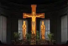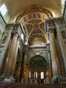 The present interior is emphatically Baroque, giving an impression of majesty and grandeur. Among the works of art are an Annunciation by Ludovico Carracci (a fresco in the central lunette of the presbytery), a Romanesque Crucifixion in cedarwood, and a sculptured group in terracotta depicting the Compianto su Cristo morto ("Lament over the Dead Christ"), by Alfonso Lombardi, of the early 16th century. In the apse are early 20th-century paintings by Cesare Mauro Trebbi (1847–1931) including Saint Anne in Glory.[1]
