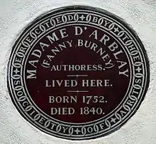 - Madame D'Arblay (pseudonym Fanny Burney), playwright, at No. 11. Her former residence is marked by a brown plaque erected by the Society of Arts;